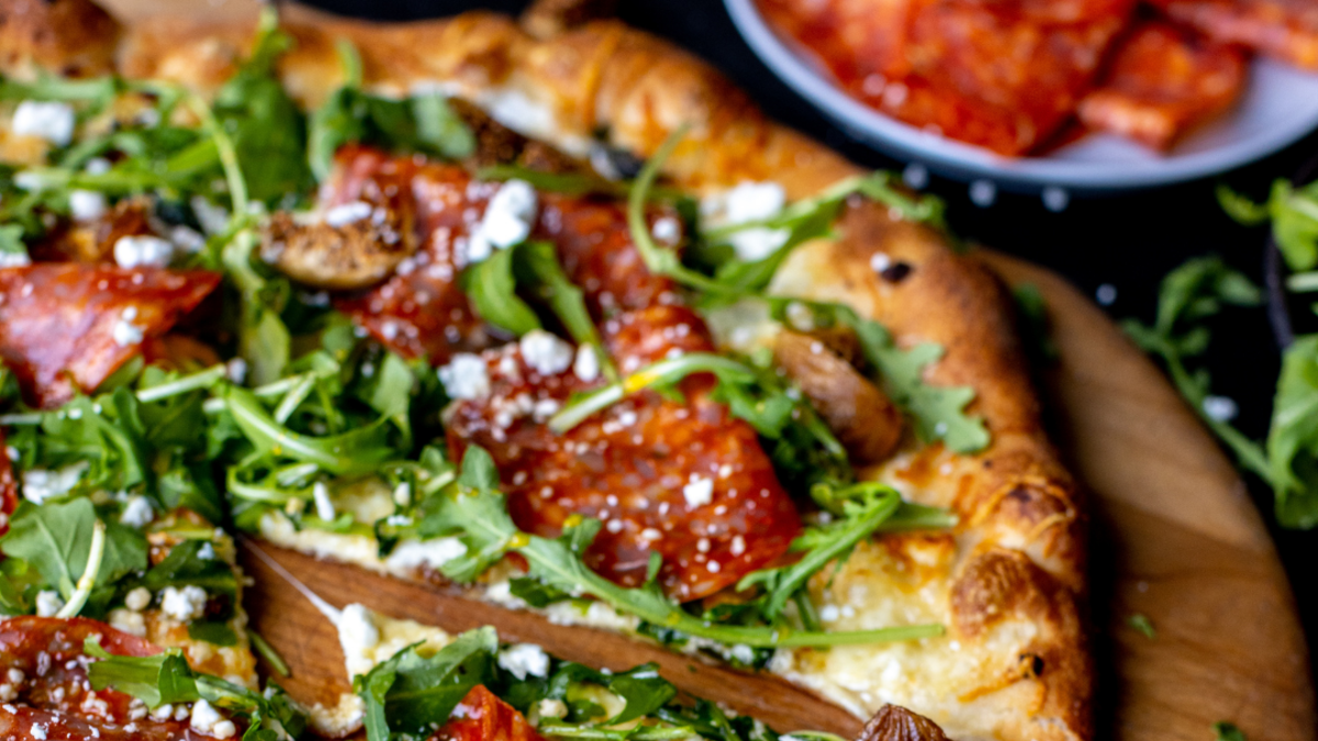 The chefs at Kings are here to inspire you with some pizza magic! This hot and sweet flavor combination is over-the-top delicious. Start with a base of goat cheese and add spicy soppressata and fresh figs (dried works well too, just be sure to rehydrate in hot water). Once out of the oven, sprinkle on arugula and drizzle on plenty of hot honey.